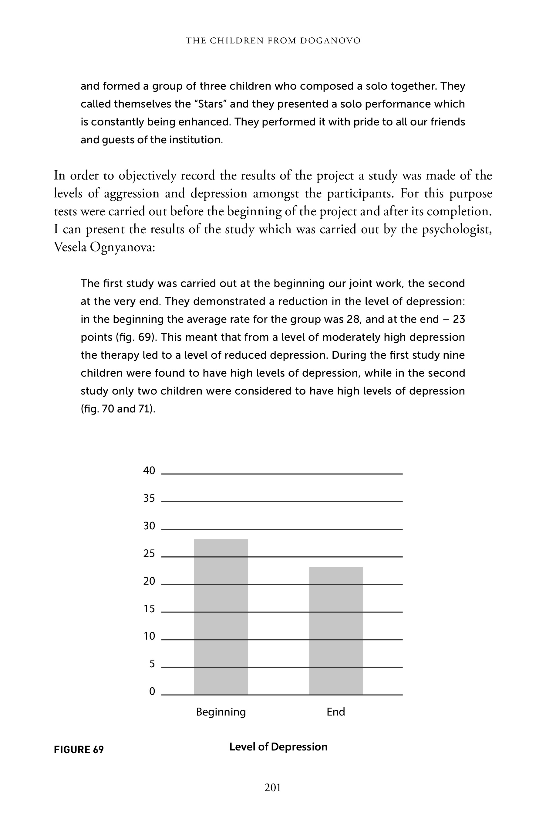 The first study was carried out at the beginning our joint work, the second at the very end. They demonstrated a reduction in the level of depression: in the beginning the average rate for the group was 28, and at the end – 23 points (fig. 2). This meant that from a level of moderately high depression the therapy led to a level of reduced depression. During the first study nine children were found to have high levels of depression, while in the second study only two children were considered to have high levels of depression